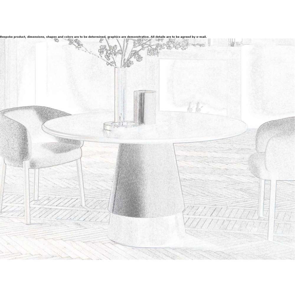 The icon of the collection is the dining table, which synthesizes all the formal and material elements of ARETHA in a play of shapes, overlaps and connections. It has a central base in the shape of a truncated cone with a metal core and double covering: in the lower part, the plinth can be made in the color of natural wood, stained or matt varnished, or even in natural stone, while the upper, tapered part is covered with a technical fabric that creates three elegant vertical stitches.