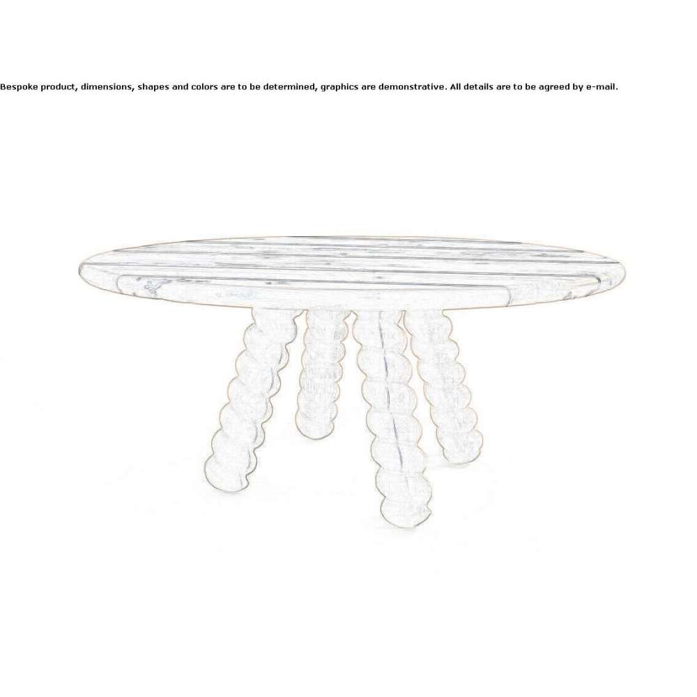 Bric is a round table with a briccoli top made of non-glued boards and 4 oak legs turned in the shape of a spiral, placed in the center and diagonally.