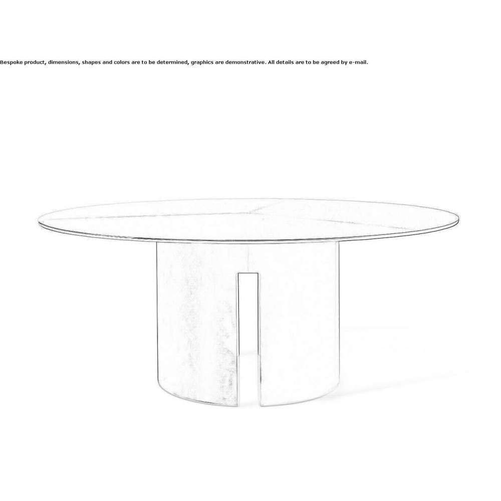 Gong are dining tables with a structure in stained oak veneer with matte or glossy lacquer, resin or bronzed brass finish. Removable base. The tabletop is available in stained oak veneer, matte or glossy varnish, back-painted glass in varnish colors, resin, brown brass, platinized steel, MR1 or MR2 marble. Available in many forms.