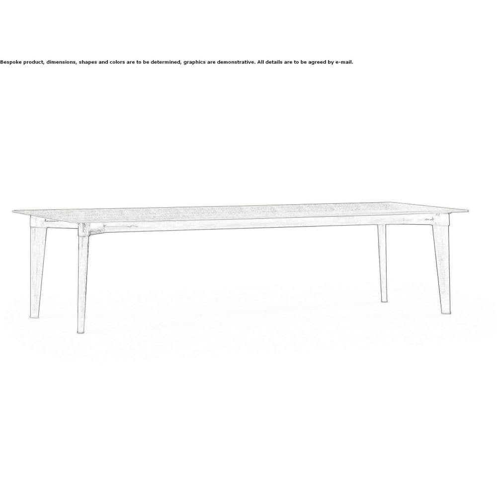 The color of the glossy tin legs and the choice of textured, pictorial wood define its refined elegance, revealing a seemingly minimalist, linear design. The tapered leg, also used in the terrace table designed by Rodolfo Dordoni, gives it a dynamic and impression of absolute lightness.