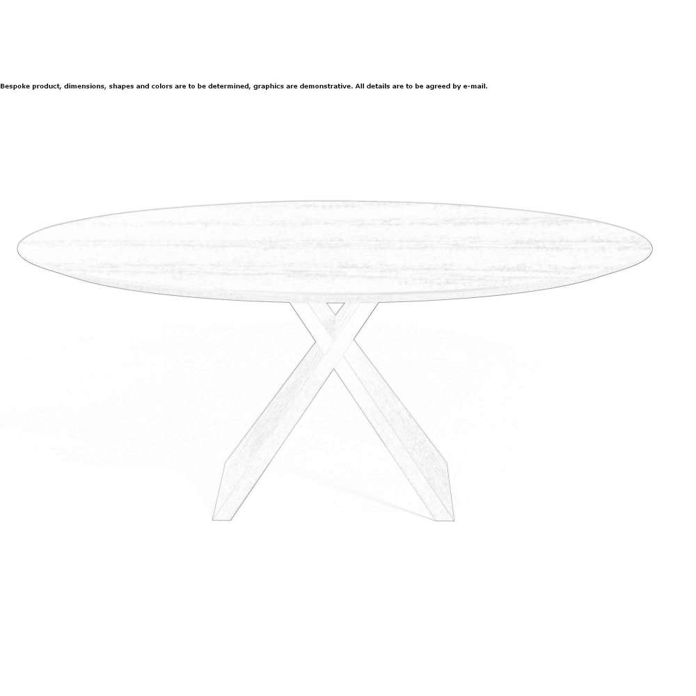 Round table the upper one characterized by a central base with crossed panels supporting the top. Round table with crossed legs. Two diameters allow for 8 to 10 seats.