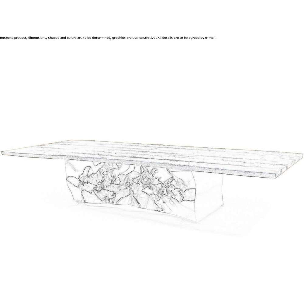 Riflessi In Laguna is a table with a top made of solid Briccola boards, not glued, with natural sides. Sculptural stainless steel base, forged by world-famous artist Helidon Xhixha.