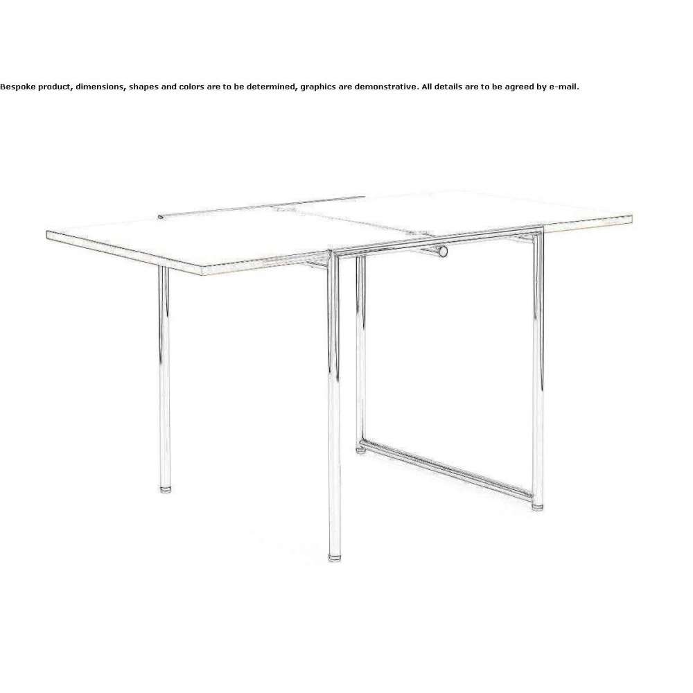 Table. Frame made of chrome-plated steel pipes. Folding tabletop, laminated with white HPL, solid beech edge. Height-adjustable metal glides.