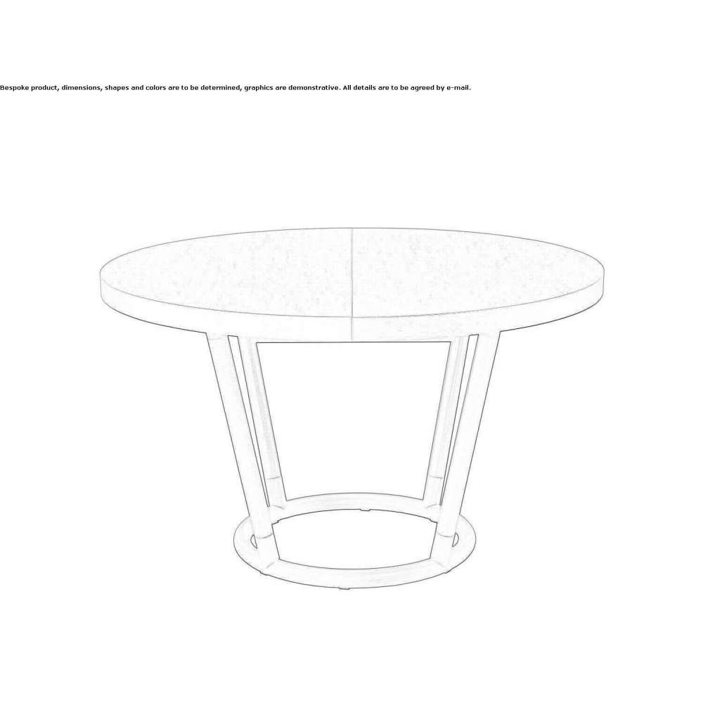 round ash-colored table, available in finishes consistent with the collection, with a round base in bronzed brass. Extendable tabletop. Architectural table in rectangular and round versions. To enliven the silhouette, in a rectangular version, the compass structure ideally consists of two overturned trestles ending with a tubular bronze and brass foot, from which the ash wood table legs in the collection's finishes bend in opposite directions.