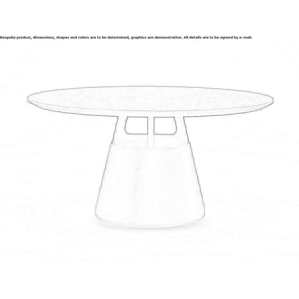 Unity is a round table with a conical base made of black eco leather. It can be equipped with a Lazy Susan swivel top, available in various materials. The table top can be made of brown walnut or marble. It is available in various sizes.