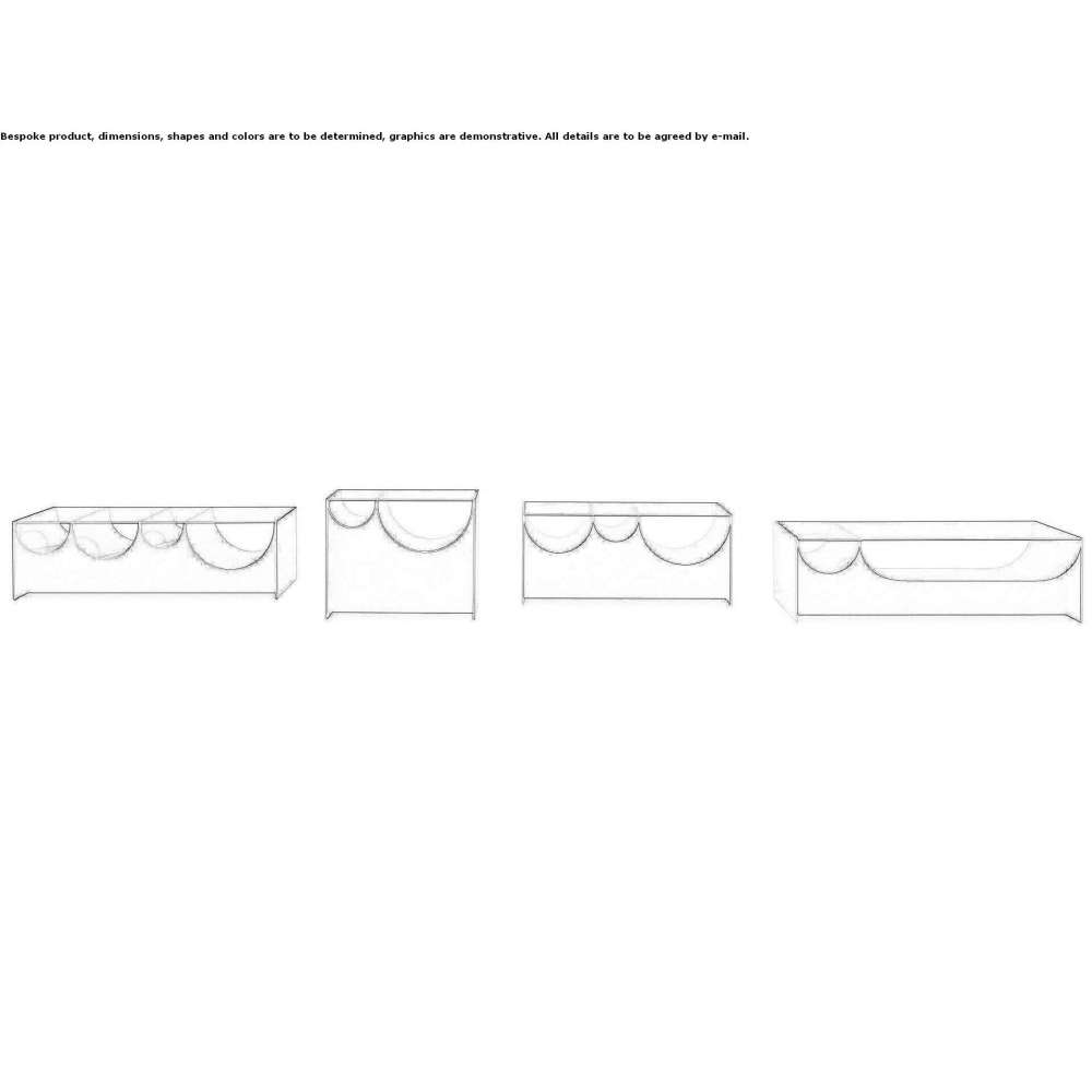 Successive inverted semi-circles creating a sinuous silhouette at the front create empty spaces for users to leave magazines, newspapers and small items on display.