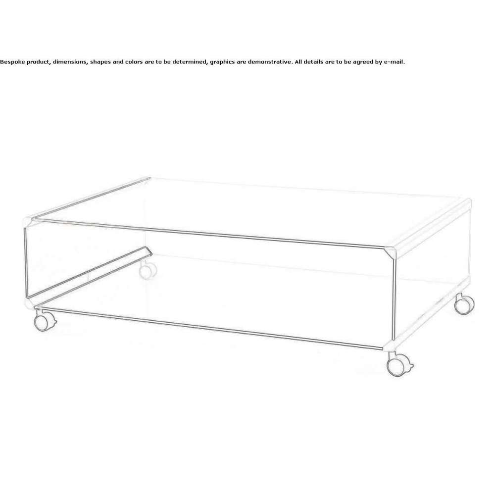 George 2 is a coffee table on wheels made of clear or smoked "grigio Italia" tempered glass, 8 mm thick. Bright stainless steel metal parts. Satin stainless steel, shiny, satin or embossed, white or black, painted brass parts to order. Version without wheels available (total height: 34cm).