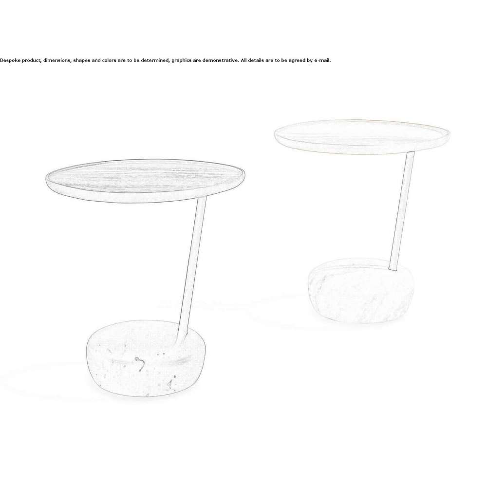 The table tops are made of ash wood boards, supported by a lead-painted metal pipe. All this rests on a marble or cement base, which brings to mind the solid, stable shape of a rock. The lasting image is the asymmetric contrast between the impressive base, the elegant body and the disc forming the top, highlighted by the elegant matching of various materials.