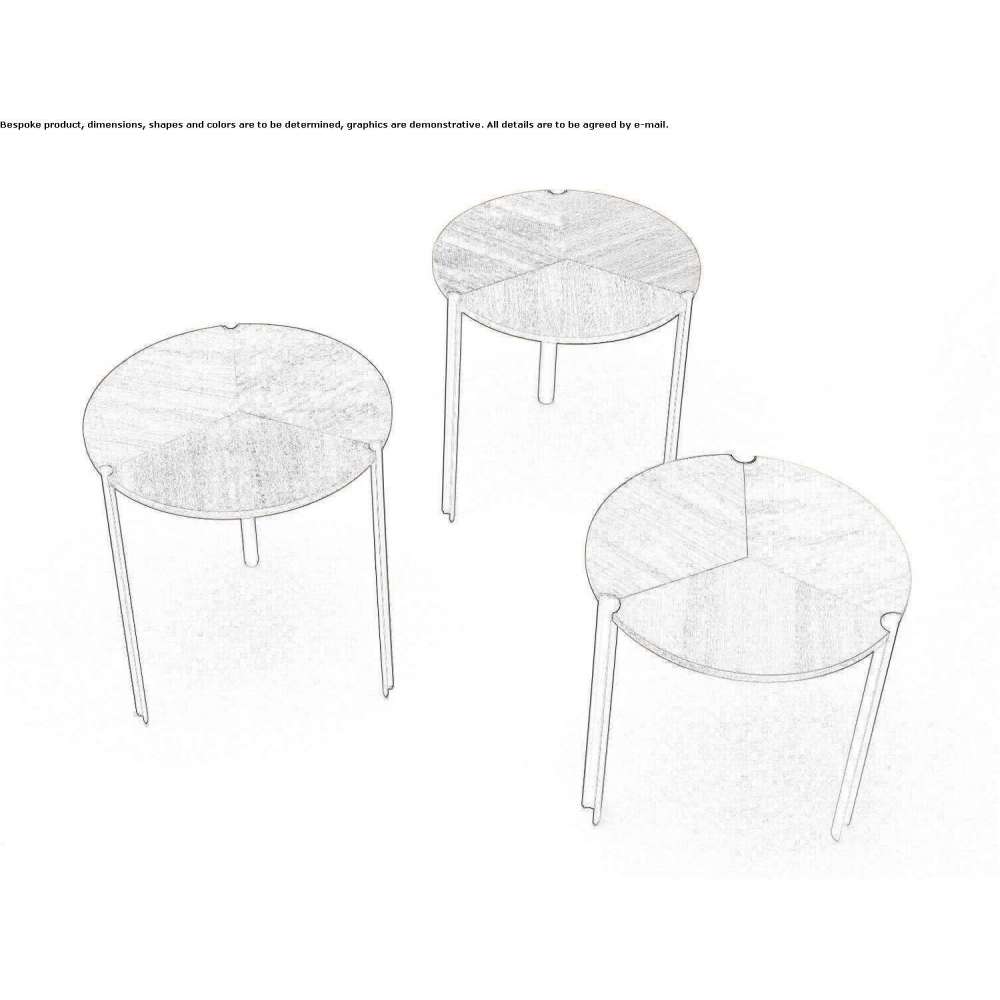STARSKY is a set of 3 stackable steel tables with a matt black RAL – K7 9017 epoxy coating and wooden tops. Each table has a 15 mm thick MDF top, veneered in three different wood combinations through marquetry and finished with water-based acrylic paint. Base consisting of 3 lacquered laser-cut tubular legs (ø25/32/40 mm) welded to a 5 mm thick laser-cut steel sheet under the upper frame.