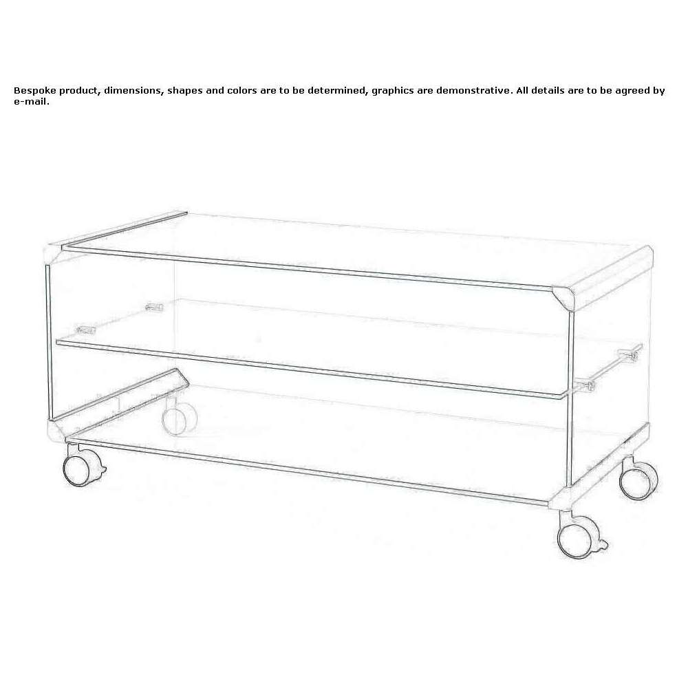 George is a coffee table on wheels made of clear or smoked "grigio Italia" tempered glass, 8 mm thick. Available with or without shelf. Bright stainless steel metal parts. Satin stainless steel, shiny, satin or embossed, white or black, painted brass parts to order.
