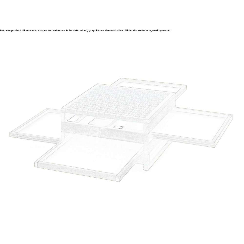 coffee table with a solid wood structure and four reversible tops. The upper part consists of a solid wood grid. The upper load-bearing side is finished in laminate, with a solid wood frame on the edge and an inner part that can be used as a tray. The tops can be customized with a variety of Sculptures Jeux finishes.