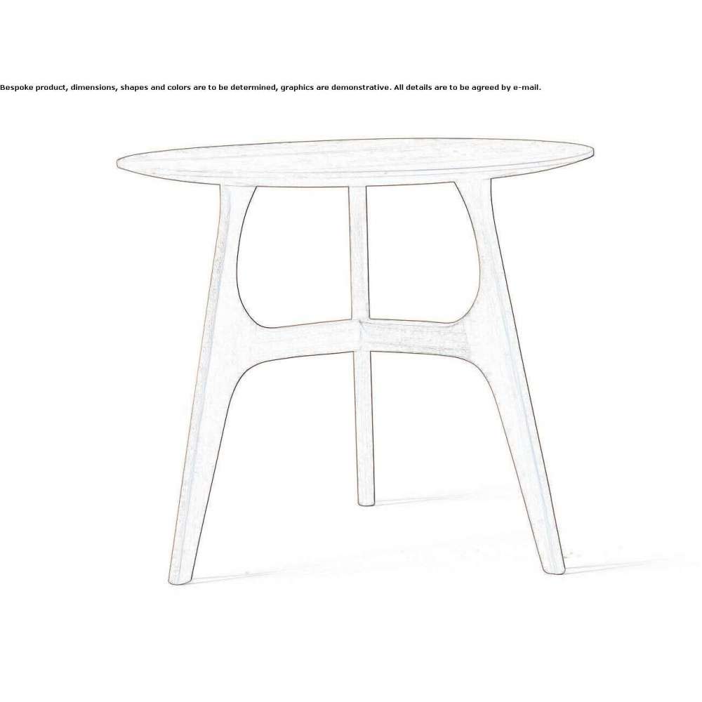 round coffee table with a refined design where the lines meet to create soft, rounded corners. The structure of the solid wood base connects the top to the legs, creating a harmonious movement of the form.