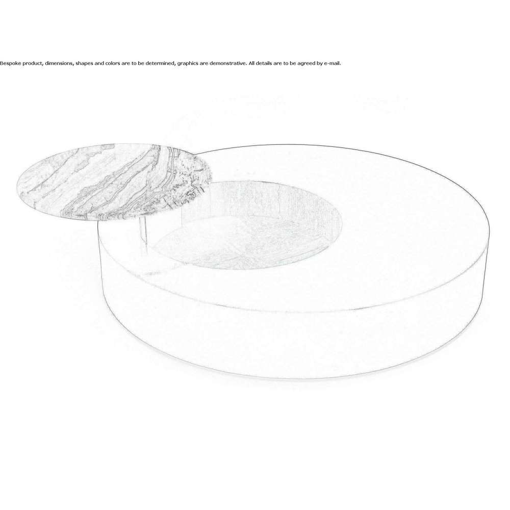 Orbital is a low round table in lacquered wood with wood veneer storage, equipped with a marble tray suspended on a rotating metal support inside the storage space. Carved marble tray with rounded edge with relief.