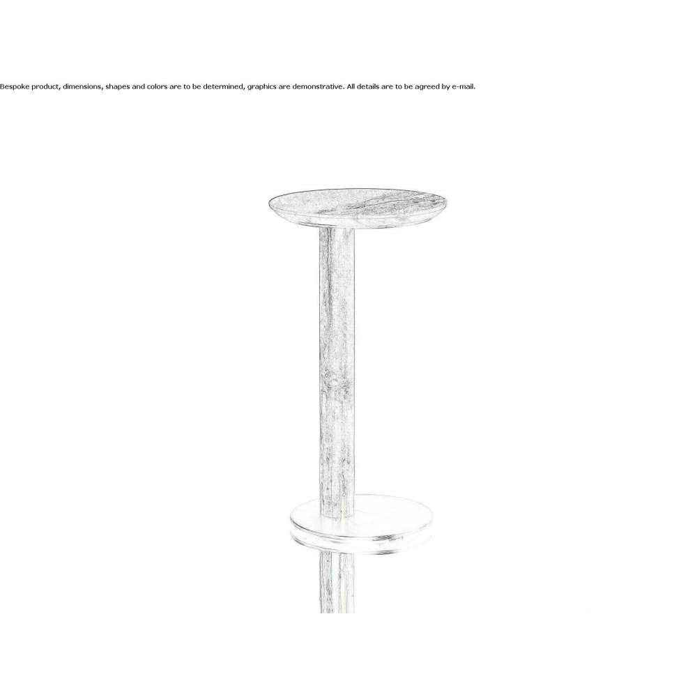 Twistable is a side table with a support in cast brass, cast bronze or cast brass in silver finish, with a metal plate or stone top and a base in steel: burnished Titanio, burnished Platino.