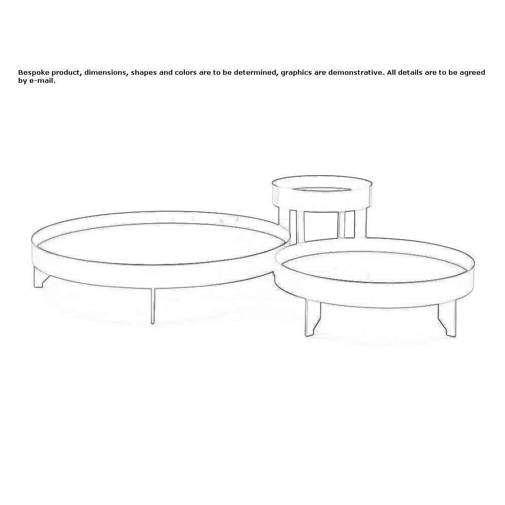 collection of round coffee tables with a simple design. 3 dimensions according to customer requirements, 4 feet arranged crosswise, frame with a steel load-bearing top. Base in bronze finish, tempered glass top lacquered in RAL 7044 and available in any other RAL color on request.
