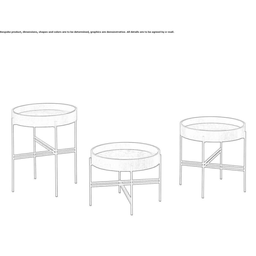 The Tray round coffee table, available in three heights, features a painted metal structure and a marble or painted glass top with an ash frame. The Tray Coffee table set is a versatile collection, presenting various combinations of shapes, heights and ends. The necessary metal frame is adapted to the size of the table and supports a marble or painted glass top, which is surrounded by a curved ash edge, creating something like a tray