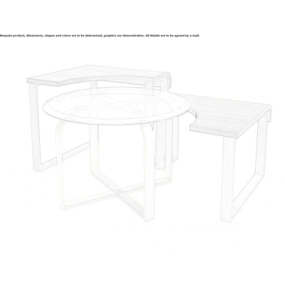 Tulip Tris is a set of coffee tables with a metal frame, satin finish. Bronze glass top (diamond-shaped beveled edge) for a round table; Canaletto walnut wooden top for side tables.