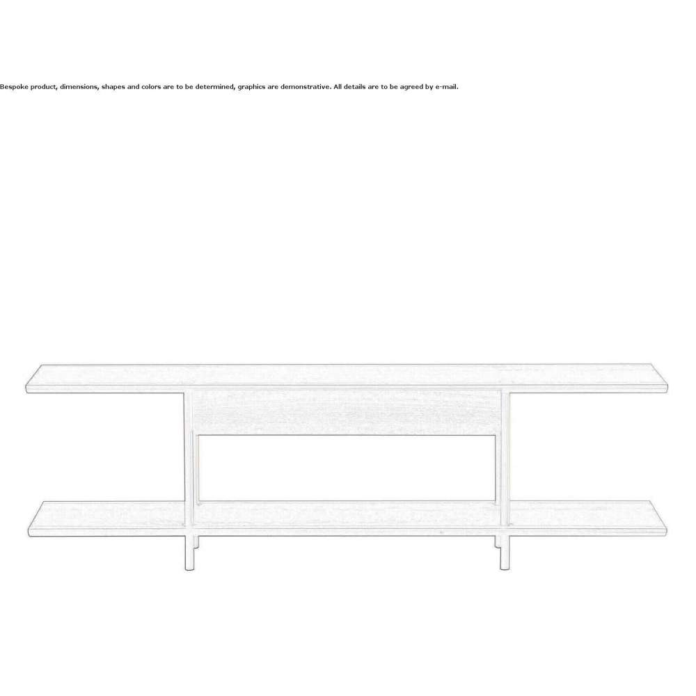Arial is a free-standing shelf equipped with two shelves made of ash wood or Canaletto walnut and a metal structure available in two finishes: in a bronzed brass structure with embossed anthracite-colored metal legs or an embossed anthracite-colored metal structure with bronze legs. Also available without a drawer and in various variants. Arial is a collection of self-supporting shelves and consoles in which the best material is wood combined with more technologically advanced materials. The clean and essential lines of this collection, characterized by a very narrow frame and reduced cross-section
