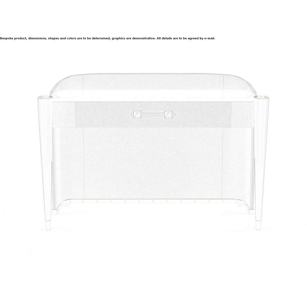 Kimberly is a console with a curved plywood frame covered in leather. Beech wood legs with metal details. Plywood drawer, decorated with quilted leather. Finishes: dark gray / gold / moka leather