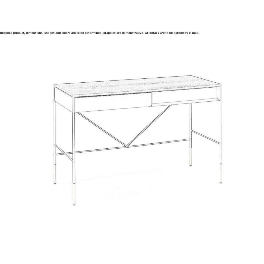 ERA desk consisting of MDF center part and MDF outer parts veneered in Stone Oak® or lacquered in "Canaletto" walnut or polished in a glossy finish RAL–K7 3005 Wine Red, RAL–K7 5020 Ocean Blue, RAL –K7 7030 Stone grey, RAL–K7 7039 Quartz gray or RAL–K7 9001 Cream; the front part is divided into an open compartment l53cm, h8.7cm and p44.5cm, always varnished in matt black, and a drawer on Blum® guides, with three compartments of different heights and capacities. 18 mm thick MDF table top, combined with a 3 mm thick brass sheet frame, painted in steel, veneered with Stone Oak® or "Canaletto" walnut lacquer, connected to the central body by means of sleeves and dowels. Brass legs screwed to Ø16mm round steel legs with integrated fasteners, connected together with Ø10mm steel rods. Floor base secured with black PVC legs. All metal parts are covered with brown-gray epoxy powder, and brass elements are satin-finished and finished with transparent matte varnish.