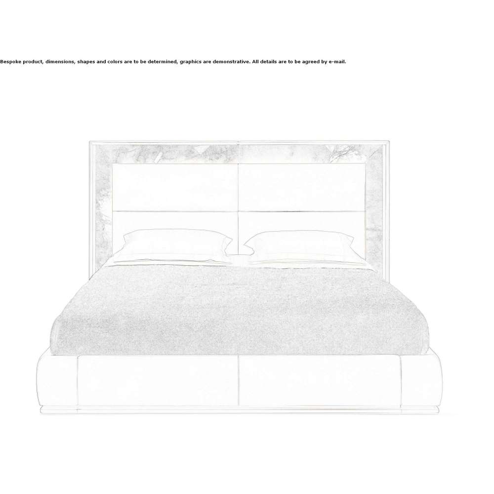 Aubade is a bed upholstered in leather or fabric. Headrest made of rectangular wooden panels, lightly padded and individually upholstered, separated by stainless steel inserts. Perimeter frame with built-in marble panels with additional LED lighting. Plinth and inserts made of stainless steel. Designed for wall mounting. The bed frame is made of multi-layer wood, padded with polyurethane and made of individual upholstered elements. Stainless steel base. Wooden slats supported by four corner brackets and one central rod, with adjustable height. Metal parts are available in a wide range of metal finishes. Shown with the Sunrise Sheet Set.