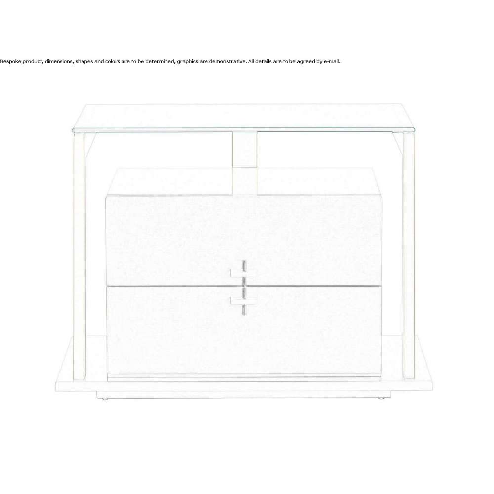 Quimera is a modern and elegant bedside table characterized by a metal structure in brushed brass or polished stainless steel, with two lacquered wooden drawers, topped with a tempered glass top. The Quimera design is complemented by brass handles and the interior of the drawers covered with suede.