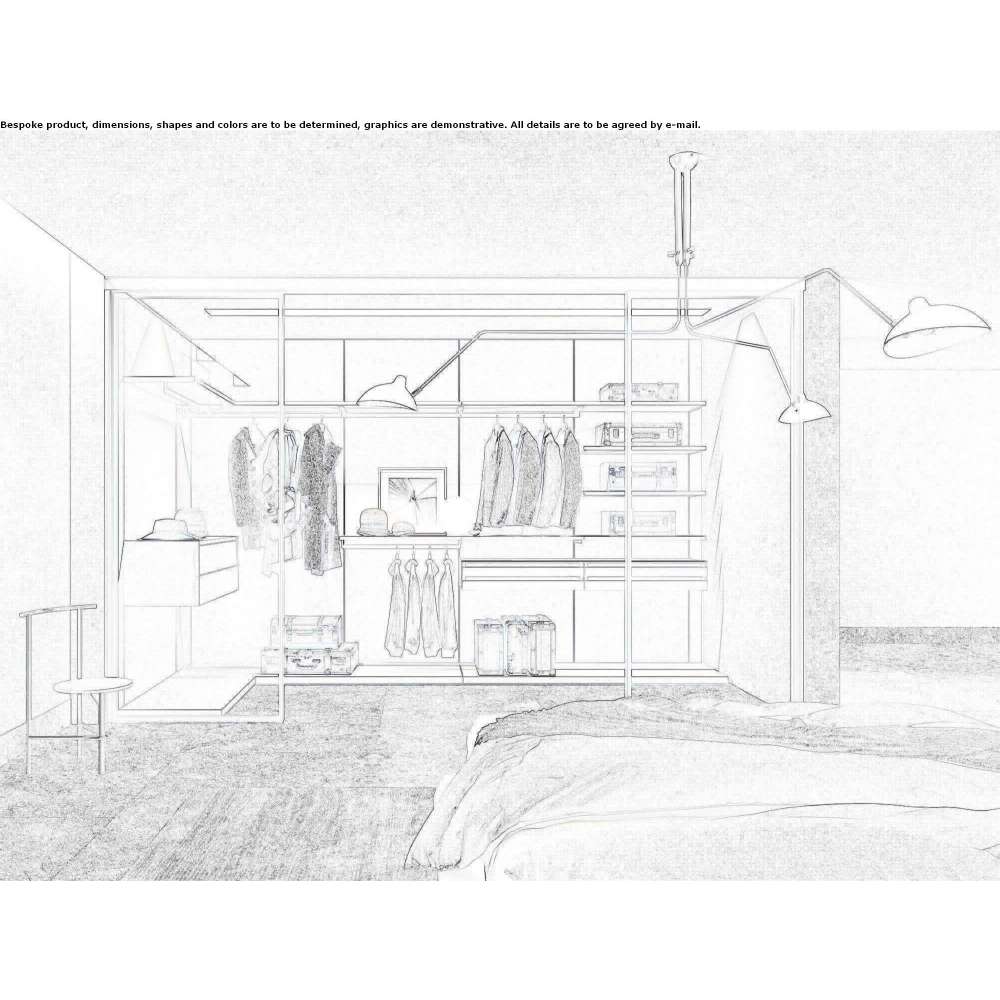 System with a rear wall: cretto cashmere panels, oxidized shelf brackets and a clothes rail, shelves with a thickness of 2.8 cm, bench, suspended drawers, trouser hanger and pull-out drawer tray arena