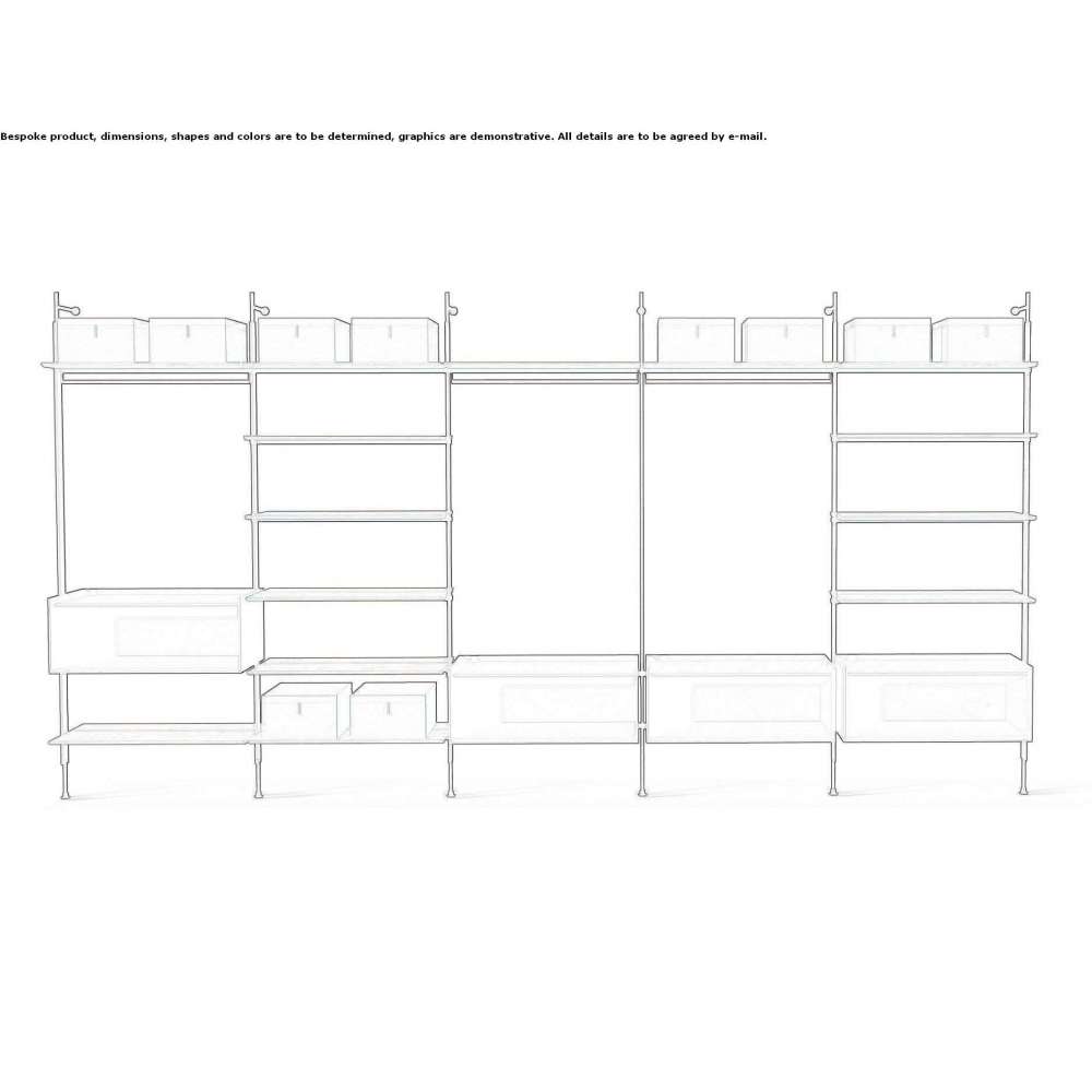 The Roll wardrobe is inspired by the bookcase of the same name designed by Dondoli and Pocci. It is a functional piece of furniture with an eye-catching theatrical effect, designed with proportions, sizes and accessories adapted to the function of the wardrobe. It is completely open and designed for linear solutions with wall attachments: its frame is in lead and the shelves are available in lead-painted wood or Canaletto walnut for an elegant contrast. Wooden containers and space-saving storage boxes can be positioned according to your needs.