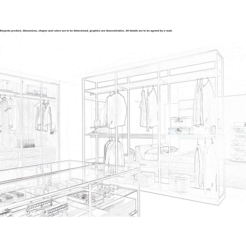 What stands out is the free-standing Storage Air wardrobe with a post in a closed continuous profile that cannot be mounted to the wall: a practical solution that makes it easy to adapt the Storage to any environment. Available with fittings made of "carbone" oak, "cenere" hemlock, mongoi, HDS or matt lacquered wood. The posts are available in white or black metal, mongoia or hemlock "cenere". Metal parts painted in white, black, "cenere" or "moka". The storage air is available with glass or wood back panels and optional glass exterior sides. Storage is a modular system that not only stores your things, but also displays them, easily transforming a wardrobe into a dressing room. To create a secret room for your clothes, the wardrobe is presented in a large horseshoe-shaped composition in a distinctive mongoi finish. On the first side there are 3 shoe shelf modules, with inclined illuminated shoe shelves with a reduced depth of 43 cm, while the second and third sides show an angular composition with a depth of 590 mm, which on both sides alternately opens modules to modules closed by Iron doors made of transparent glass with lacquered metal profiles in an iron look. Thanks to new internal modifications and accessories, keeping your clothes organized has never been so easy and enjoyable. Shoe cabinet with hinged lighting shelves, non-tilting lighting shelves, glass shelves closed with a wooden profile so you can see what's inside, drawer with hinged, removable mirror, tie rack to hang on the panel, removable clothes rack, compartment for bag and fabric drawer storage boxes for storing sunglasses, necklaces, watches and belts: all these functional features add a warm, inviting touch to your home or elegant boutique. The self-supporting Storage Air wardrobe closes the fourth side, sides and back made of transparent glass.