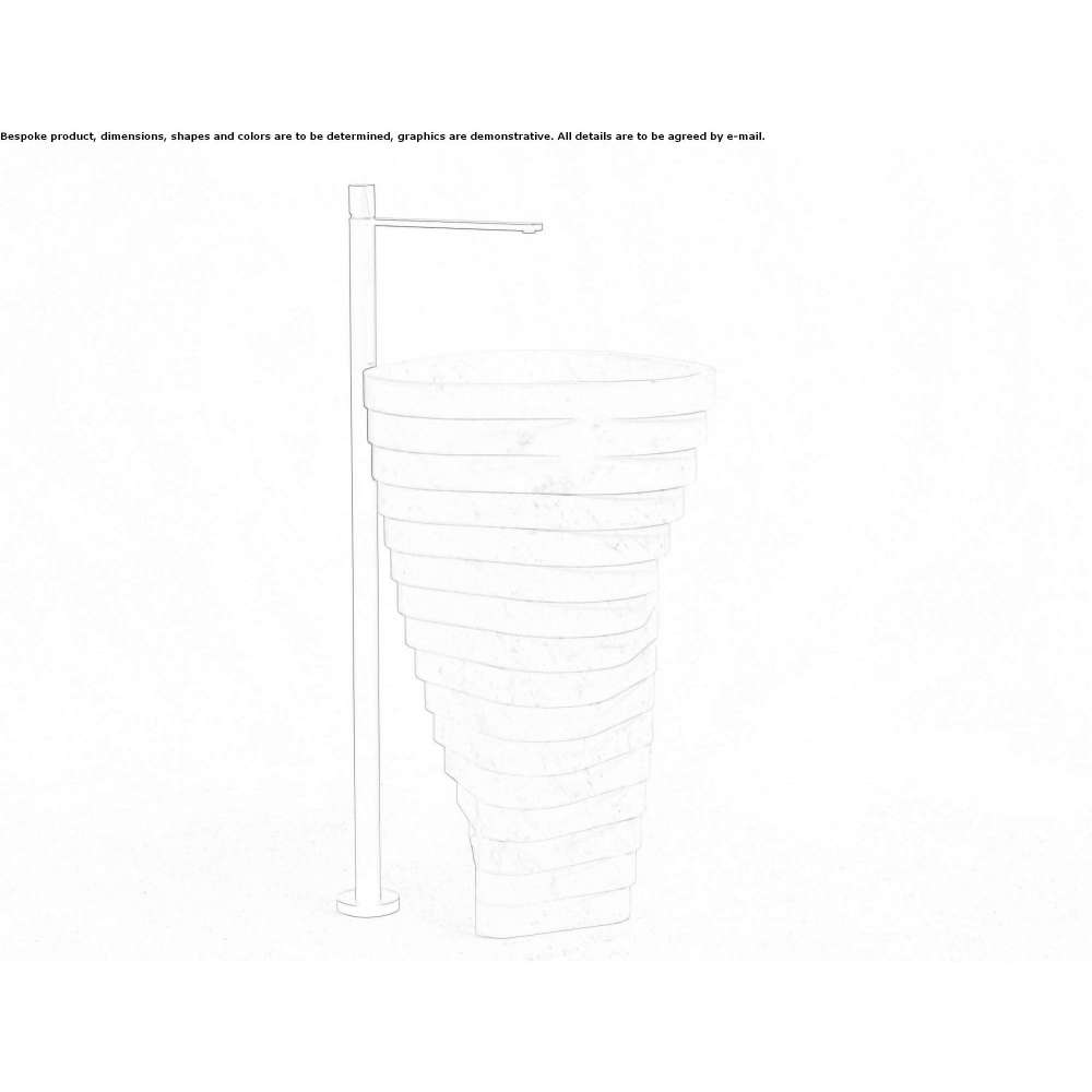 The Vortice is a freestanding stone sink with floor drain, complete with open plug, siphon and flexible hose.