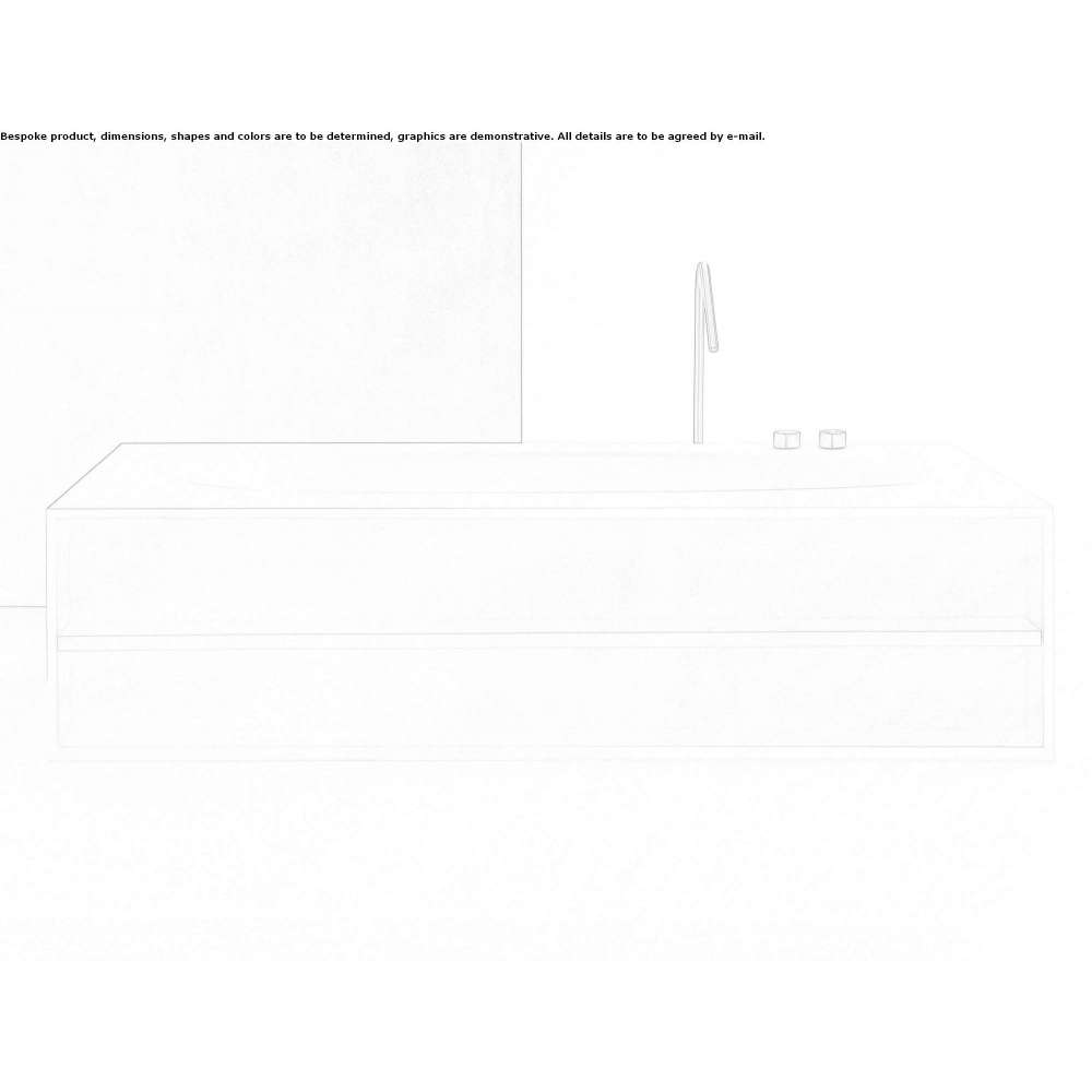 Freestanding Cristalplant bathtub, width from 185cm to 210cm, with a wooden shelf. It can be mounted on the wall or placed in the center of the room. Cristalplant drain plug cover.