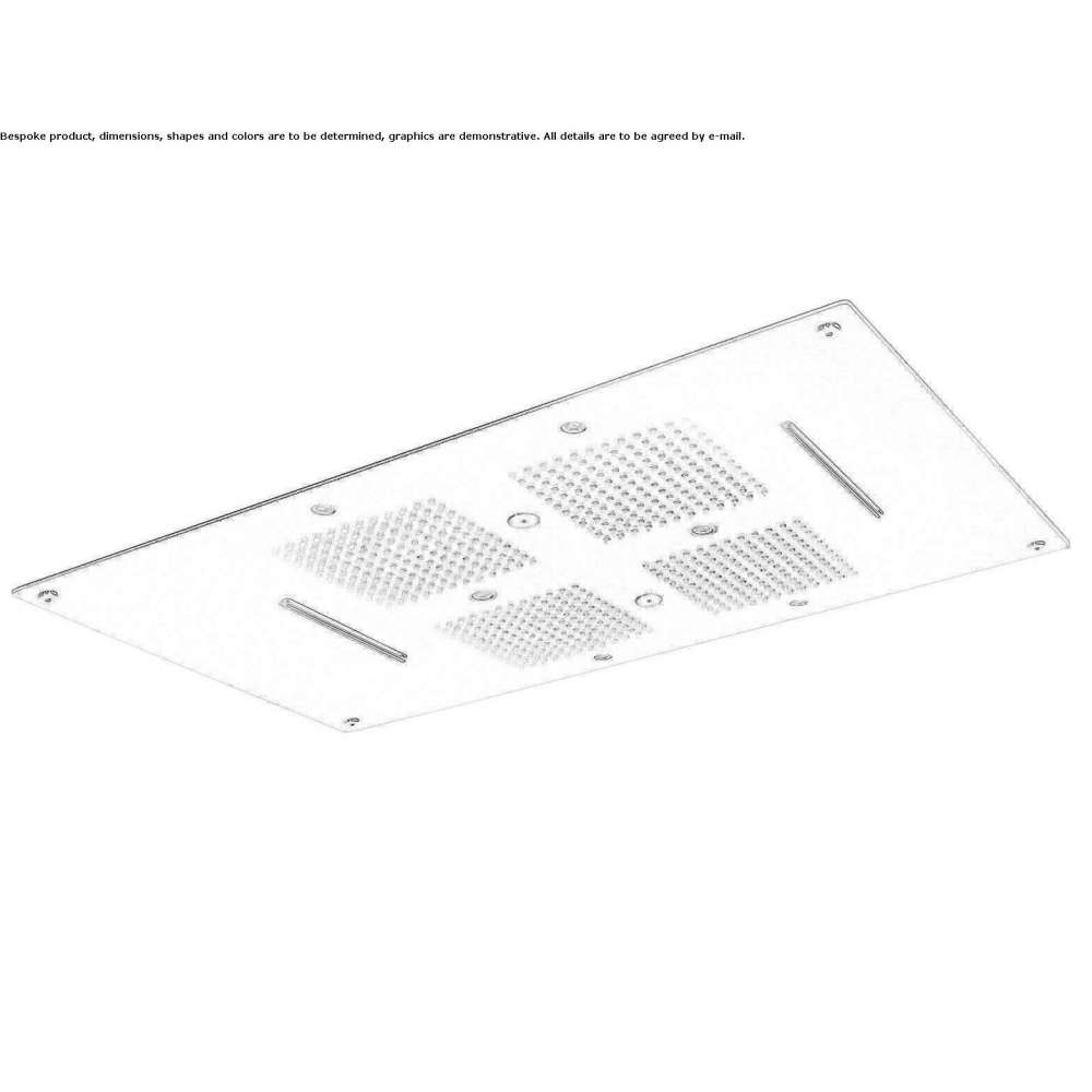 SF001 B Shower head for suspended ceiling 850x540 mm · 3 streams: rain/double cascade/mist · Water inlet 1/2” · 6 RGB LEDs · with remote-controlled light switch · low voltage transformer (12V) · stainless steel support frame included · must be matched to the 3-way mixer SF001 C False ceiling shower head 850x540 mm · 3 streams: rain/double cascade/mist · 3/4" water inlet (electrovalves) · 6 RGB LEDs · with multi-function switch remote control lights br />· n. 2 low voltage transformers (12V) · stainless steel supporting frame included · must be matched to a one-way battery SF001 D Shower head for suspended ceiling 850x540 mm · 3 streams: rain/double cascade/mist · 1/2" water inlet · 6 RGB LEDs · required control key to turn on /light switch · low voltage transformer (12V) · stainless steel support frame included · must be matched to a 3-way mixer connected to a 3-way mixer Character , force and movement to harness water in all its shapes: rain, waterfall and fog. Large sizes and multifunctional products for maximum comfort.
