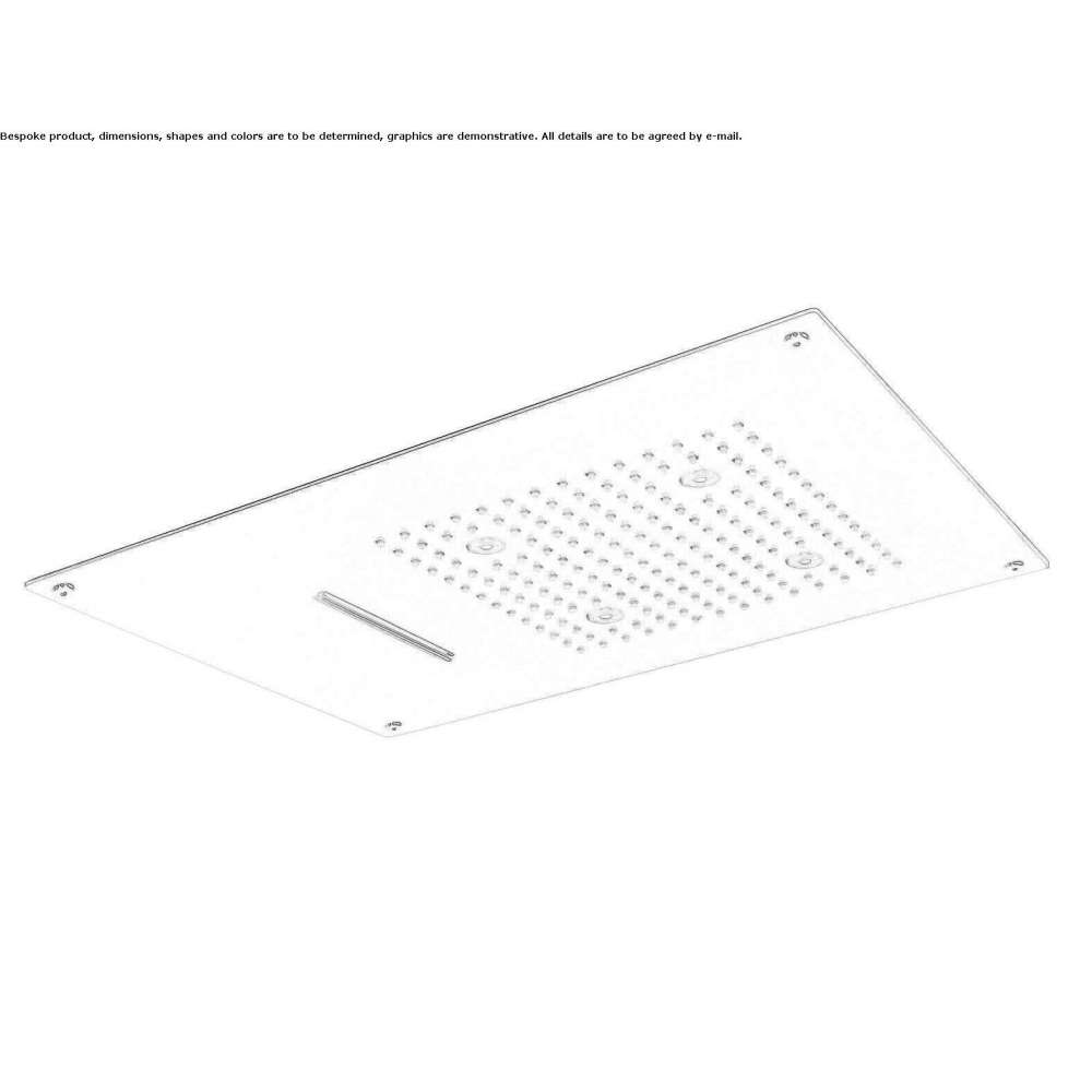 SF012 A Shower head for suspended ceiling 550x400 mm · 2 streams: rain/cascade · Water inlet 1/2” · 4 RGB LEDs · with sensor light switch movement /> · low voltage transformer (12V) · stainless steel supporting frame included · must be matched to a two-way mixer SF012 B Hand shower for suspended ceiling 550x400 mm · 2 nozzles: rain/cascade · Water inlet 1/2” · 4 RGB LEDs · with light switch remote control · low voltage transformer (12V ) · stainless steel steel supporting frame included · must be matched to a two-way tap SF012 C Shower head for suspended ceiling 550x400 mm · 2 jets: rain /cascade · 3/ 4" water inlet (electrovalves) · 4 RGB LEDs · with multi-function remote light switch · Low voltage transformer (12V) · Stainless steel supporting frame included > · must fit the one-way tap SF012 D Shower head for suspended ceiling 550x400 mm · 2 jets: rain/cascade · Water supply 1/2” · 4 RGB LEDs · required control key to turn the light on/off · low voltage transformer (12V) · stainless steel supporting frame included · must be matched to the vieCharacter 2-way mixer, strength and movement to harness water in all its shapes: rain, waterfall and fog. Large sizes and multifunctional products for maximum comfort.