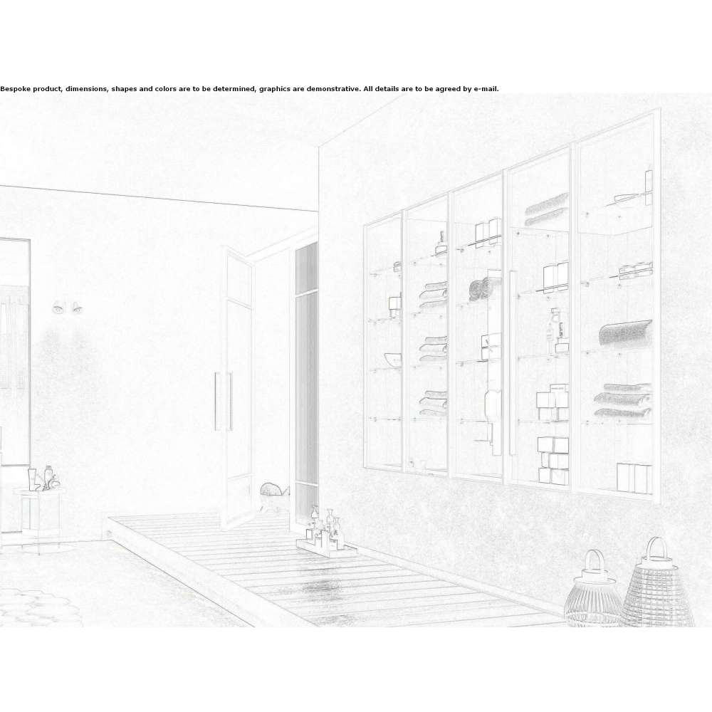 Passepartout has a wide range of wall cabinets available in several sizes. The 210 cm high cabinets can be used as floor shelves due to their large capacity. These wall cabinets feature a polished aluminum door frame with a 180° opening angle, where the glass can be ultra clear, brown or fumé (polished or matte finishes are available). Passepartout, thanks to its geometric simplicity, fits perfectly into the entire "Metamorphosi" series.