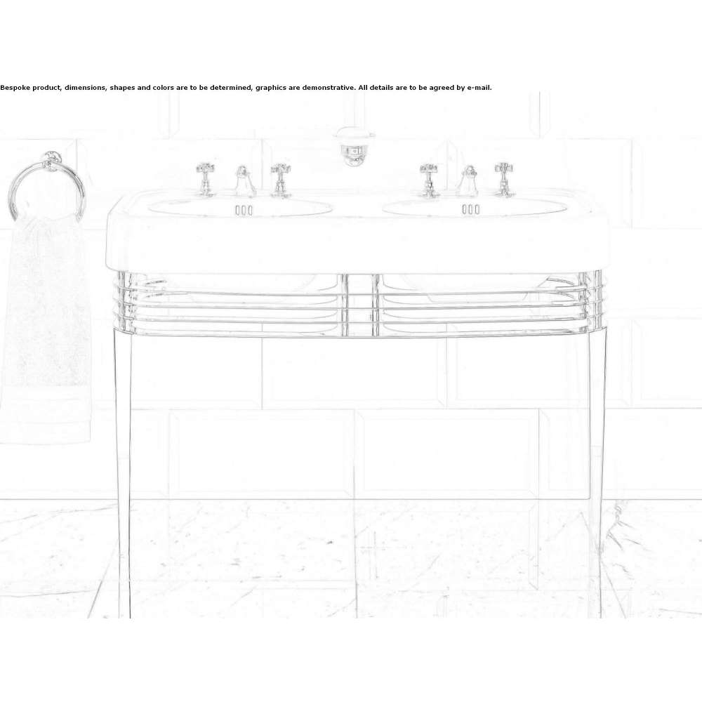 Blues is a large console characterized by a solid, geometric construction of a ceramic single-block top with two large oval sinks. On pyramid-shaped legs, it supports an aluminum structure made of horizontal metal strips inspired by the original design of the most luxurious vintage cars. It is available in chrome, light gold and polished nickel.
