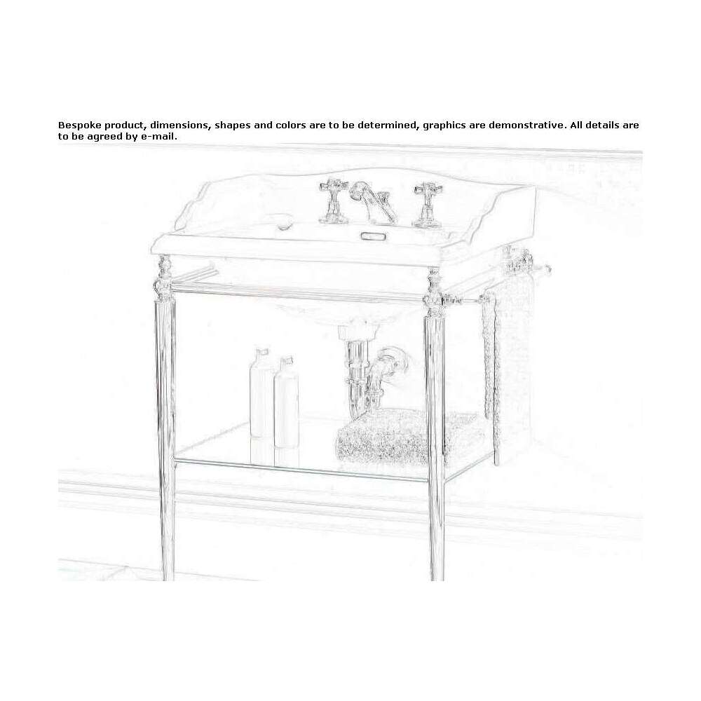 The bon tone atmosphere and elegance of times gone by is represented in the tubular metal structure, refined by lightweight tapered legs in turned brass, available in chrome, light gold or polished nickel finishes. The console is complemented by a ceramic Cambridge washbasin, a towel rack and a glass shelf.