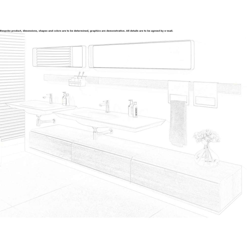 Mertens offers a variety of sink and countertop combination options, including a rectangular block covered with natural granite that gives the sink its shape. Another option is a frosted suspended glass top, scratch and fingerprint resistant, finished with a beveled oak edge at the base that hides the wall supports. The offer also includes a mirror with an internal compartment hidden behind the mirror.