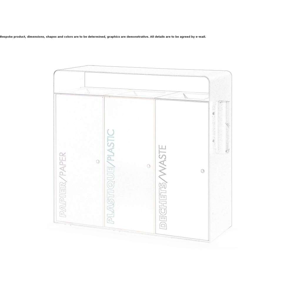 The Bund is a rectangular waste bin consisting of a supporting structure made of thick sheet steel, closed with a steel sheet panel at the back and three doors with a snap lock at the front. It is equipped with a rain cover, three conveyors for inserting waste and three rings securing bags for selective collection.