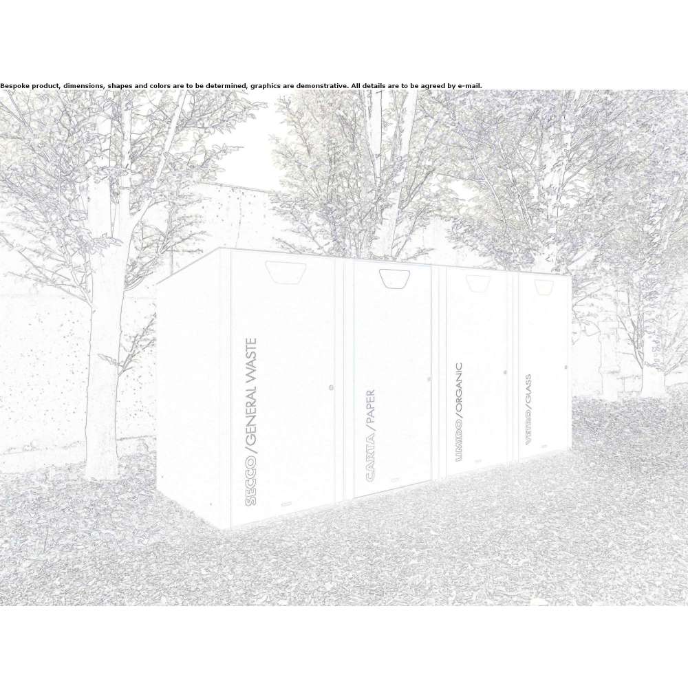 Cover 240 is a waste bin made of steel, consisting of a supporting structure of steel pipes, covered with three side panels, an inclined rain cover, a front door equipped with a lock and an opening with a conveyor for introducing garbage. The structure is designed to accommodate a container that can be transported on a trolley, with a capacity of 240 L (not included). Waste bins can be placed next to each other, creating islands for separate collection.