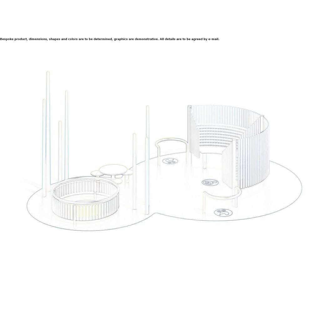 Carin Island is an internal structure consisting of two different functional areas. The first one is equipped with a semi-circular panel protecting both the tabletop, which serves as a changing table, and the seating system with backrest, dedicated to breastfeeding. The area is equipped with two steel structures that serve as parking for strollers. The second zone is equipped with vertical decorative elements and a circular fence that defines a protected play area for children.