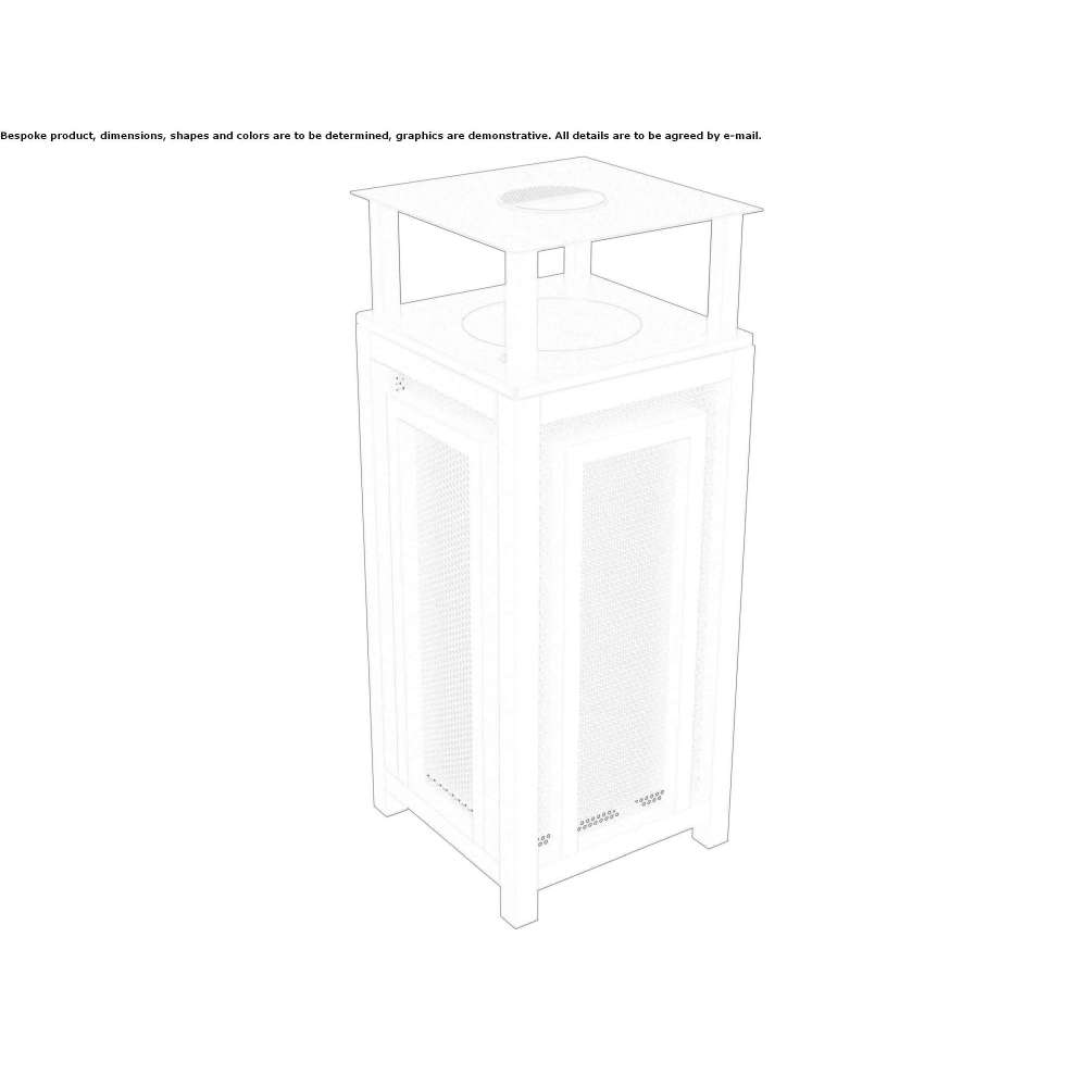 An outdoor waste bin with elegant and basic lines inspired by the Mackintosh. The entire frame consists of a square profile made of galvanized steel, cut at an angle of 45°, the perforated sheet metal in the structure allows light and air to pass through, giving elegance and visual lightness. This variant of the waste bin has an upper plate that serves as a protection for the mail bin in the event of rain and as a support for the ashtray. The bench has plates welded to the base with holes for anchoring in the ground. Supplied in an assembly kit. Painting in RAL color. A collection of elegant and timeless street furniture inspired by the tense and sharp lines of the famous architect Charles Rennie Mackintosh, author of the geometric branch of Art Noveau.