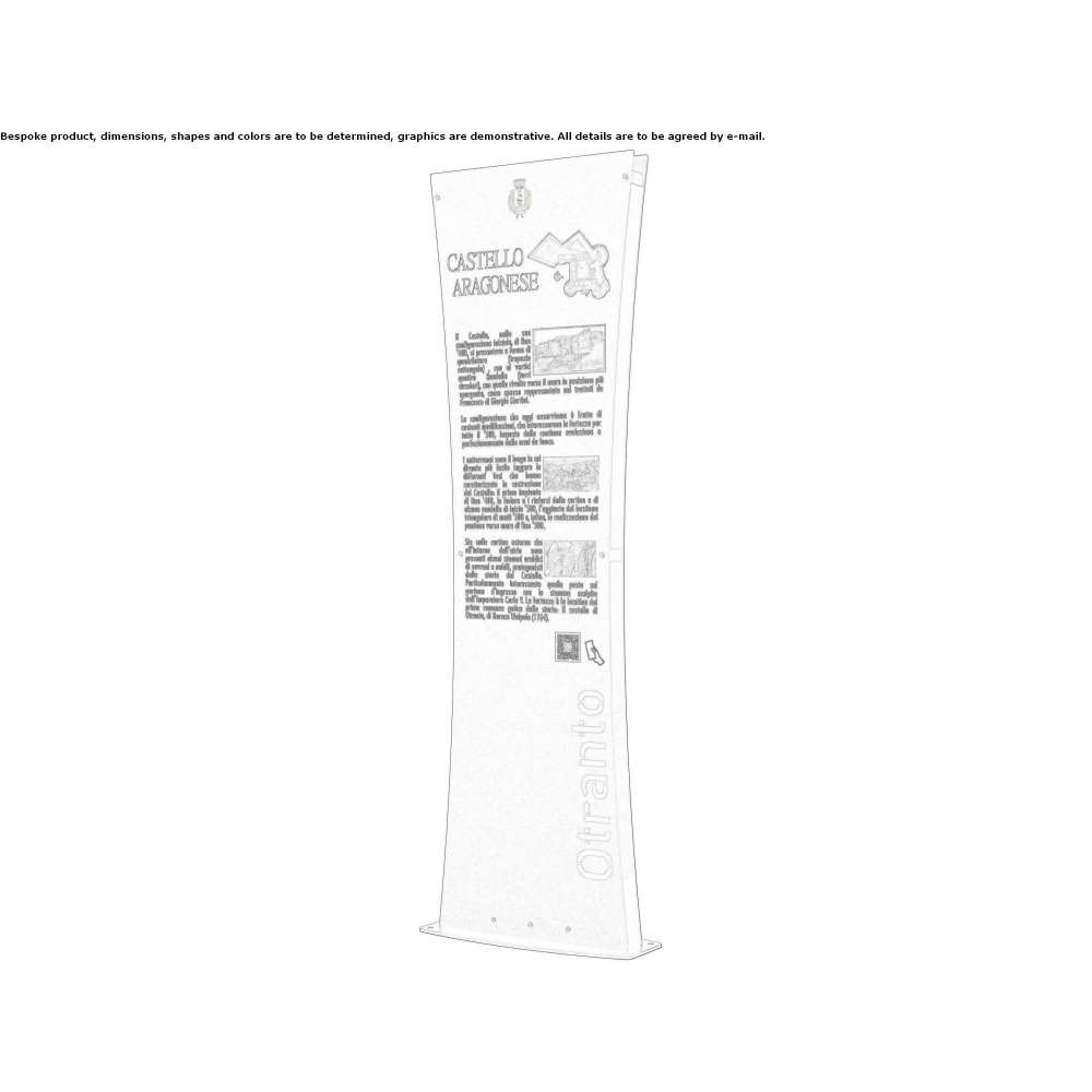 Information such as maps, historical notes and images are printed directly on the steel panel and, thanks to the additional transparent paint, can be considered durable. It comes with a plate at the base with holes for attaching to the ground with screws (not included). Powder coated with epoxy resin. and available in the following RAL colors: brown 8002, brown 8017, gray 7016 or corten (other colors on request). Includes a laser engraving with the institution's name.