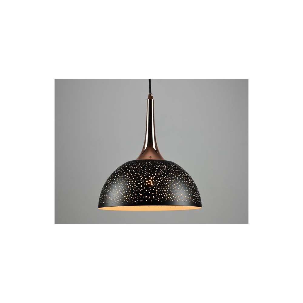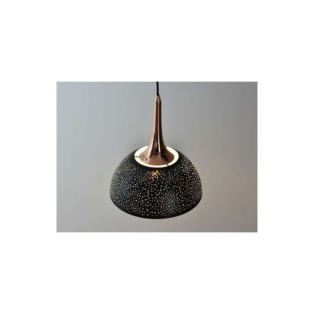 Introducing the Santo Hanging Lamp in Black, a stunning and modern lighting fixture that will elevate the ambiance of any room it graces. This original and fashionable lamp features a sleek black design with a striking copper-colored hood, adding a touch of elegance and sophistication to your space.