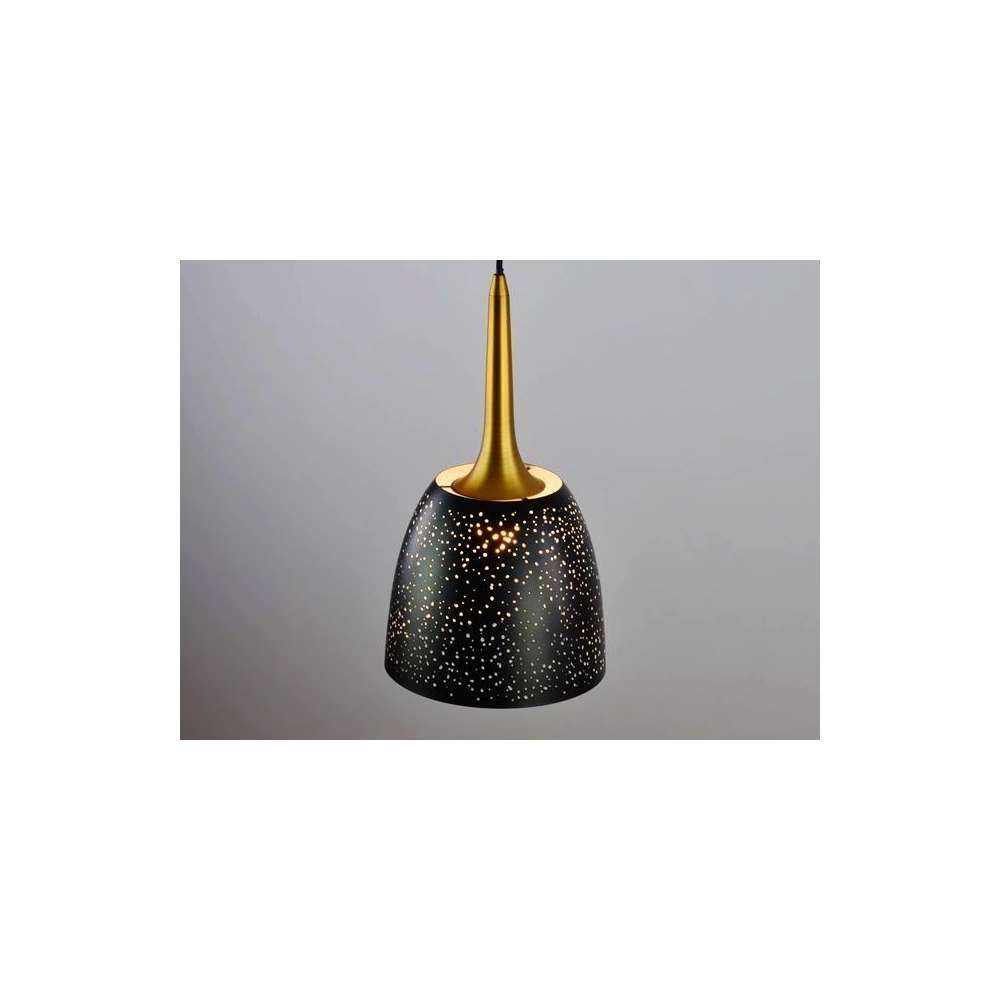 Crafted in a striking black color with an antique gold-colored extension cord, the Santo Hanging Lamp exudes sophistication and charm. Its unique design and color scheme make it a versatile choice for various rooms, including the bedroom, kitchen, children's room, hotel, restaurant, and office. Whether you're looking to create a cozy atmosphere in your bedroom or add a touch of modern flair to your office, this lamp is the perfect choice.