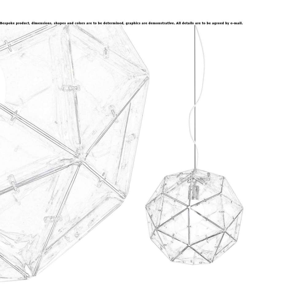 Poliedro to lampa wisząca dająca rozproszone światło. Zawieszony na stalowej linie. Rama przyłączeniowa z chromowanego metalu. Dyfuzor składający się z 60 identycznych modułów w kształcie trójkątów, wykonanych z przezroczystego poliwęglanu i połączonych ze sobą przezroczystymi śrubami. Do żarówki LED.