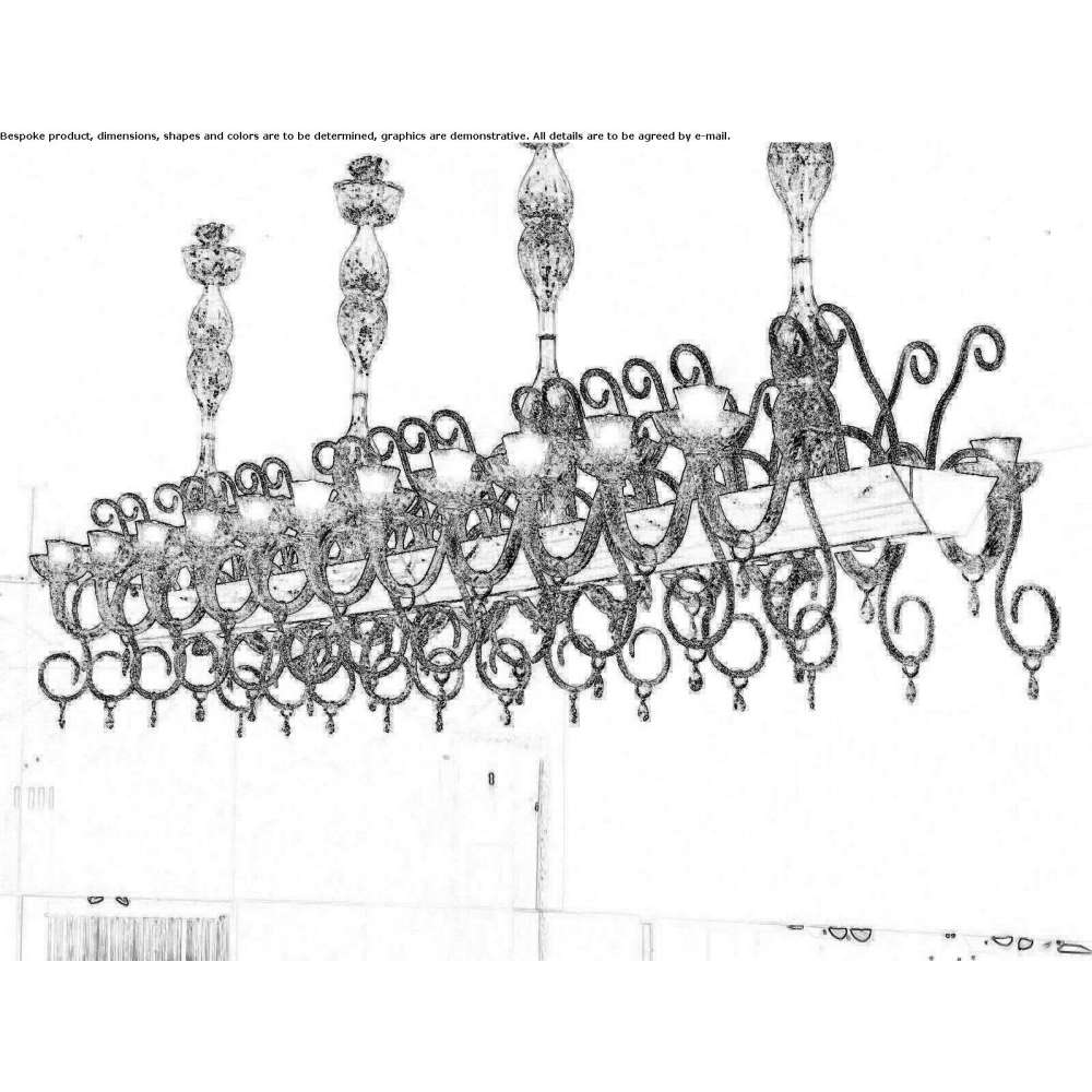 Żyrandol modułowy złożony z elementów z grawerowanego kryształu oraz ramion i pastorałek z przezroczystego szkła Murano. Metalowy wspornik pokryty przydymionym szkłem lustrzanym z grawerami Diamante. System oświetlenia LED ((3,5W G9 110-240V 3000K).