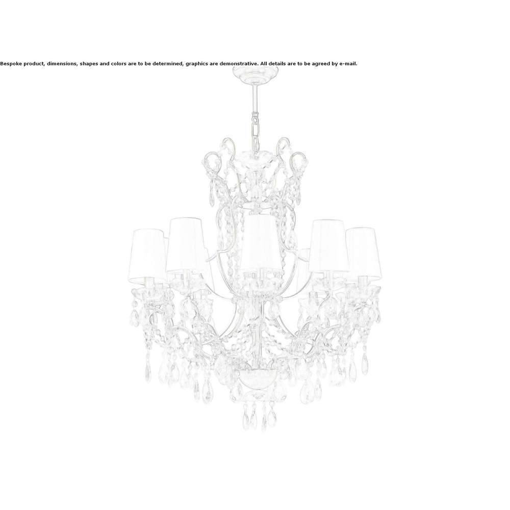 Lucienne to ręcznie malowany metalowy żyrandol dostępny w różnych wykończeniach, świecznikach i łańcuszkach pasujących do metalowych wykończeń. Abażury sprzedawane są osobno. Hak sufitowy nie jest dostarczany.
