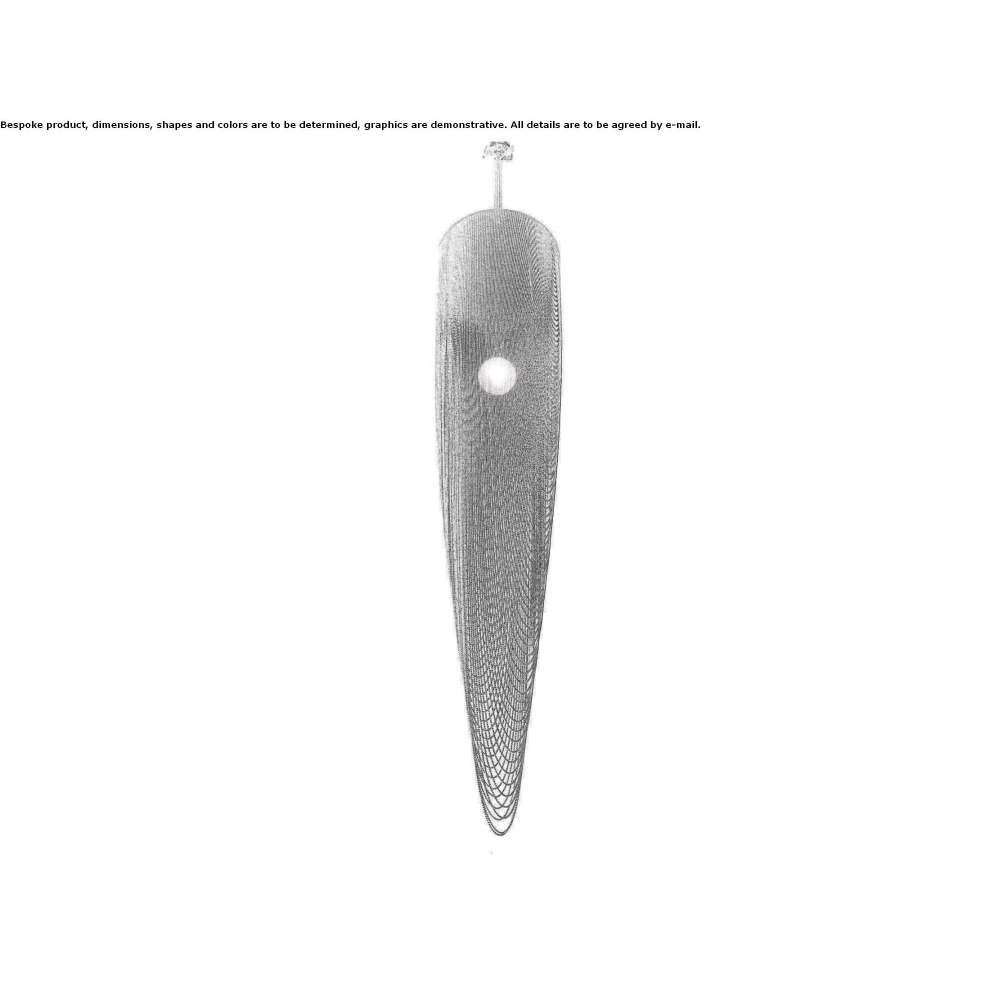 Bardzo długi i elegancki wisiorek w kształcie POD. Wykonane z wycinanych laserowo ram ze stali nierdzewnej, chromowanych lub lakierowanych, elementów z litego mosiądzu i łańcuszka kulkowego w kilku opcjonalnych wykończeniach. Oświetlane kulą ze szkła żaroodpornego zawierającą lampę halogenową G9.