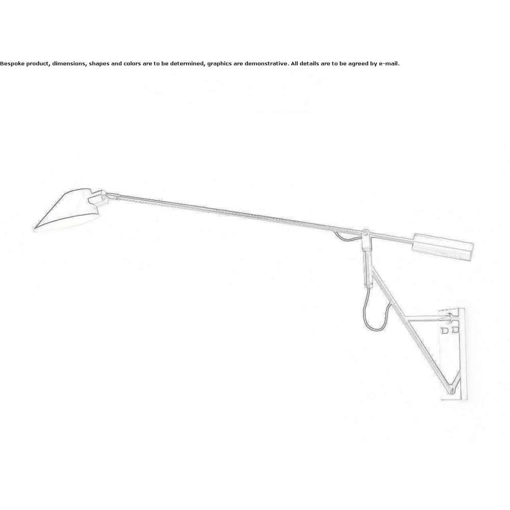 Metalowa lampa ścienna. Chromowane wykończenie. Klosz w błyszczącej bieli lub czerni. Długa tuba z punktem świetlnym na końcu i przeciwwagą na przeciwległym końcu, służącą do wyważenia lampy. Rura centralna zbudowana jest z dwóch przegubów kulowych: jeden umożliwia obrót o 180°, a drugi ruch w pionie. Również przegub kulowy w oprawce E27. Żarówka nie jest dołączona.