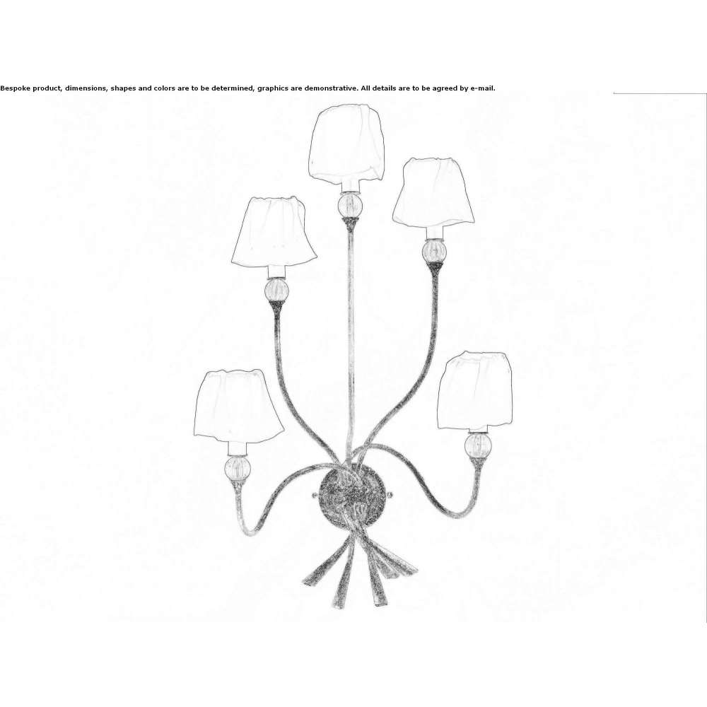 Żelazne kinkiety ozdobione mocowaniami ściennymi i szklanymi elementami. Miękkie jedwabne abażury. Oświetlenie LED w dolnej części.